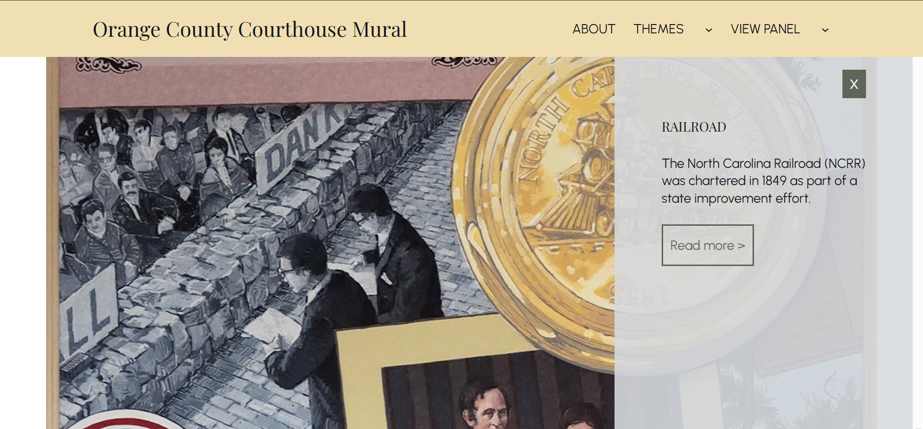Resume Github EmailDesigned and developed a custom WordPress site to digitize a mural in the Orange County Courthouse, making images of the mural interactive and accessible to allow users to view more information about the mural's subjects. Winner of the UNC SILS department's 2025 Dean's Practicum Achievement Award.